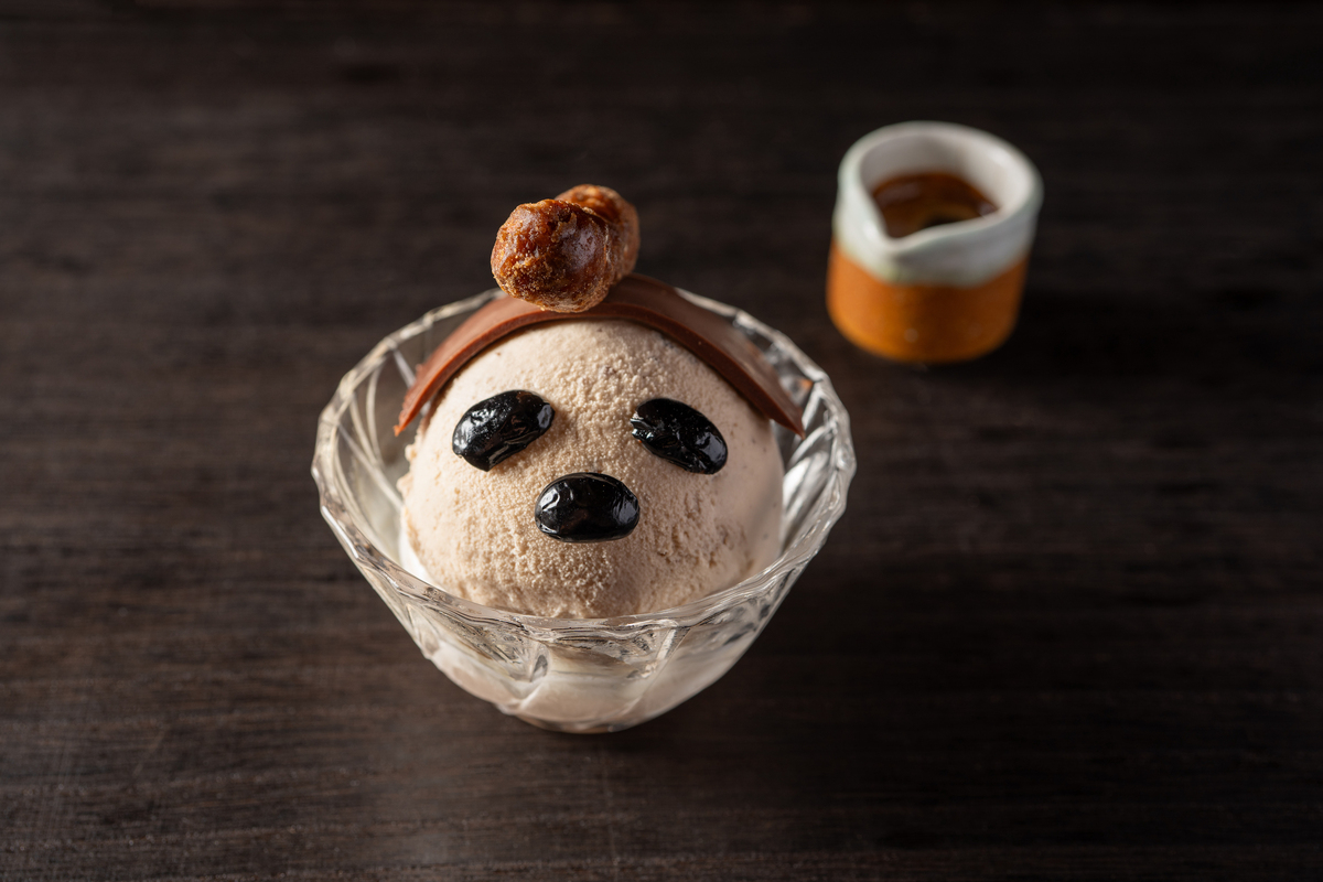 渋皮栗のアイスに力士のまげをイメージした、かりんとうをのせて可愛い力士に姿に!