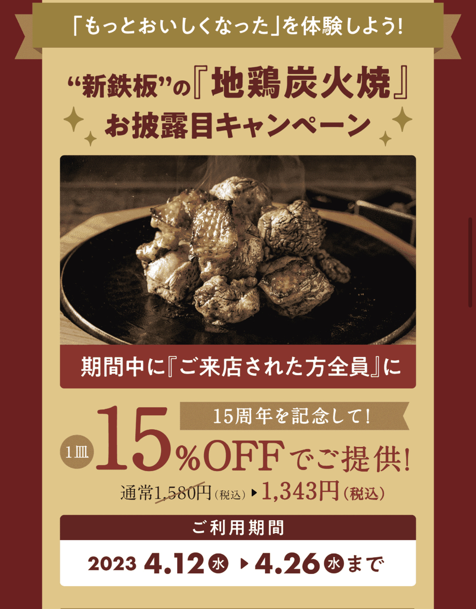 ★15周年特別企画第6弾★地鶏炭火焼、さらなる極みを追求!!