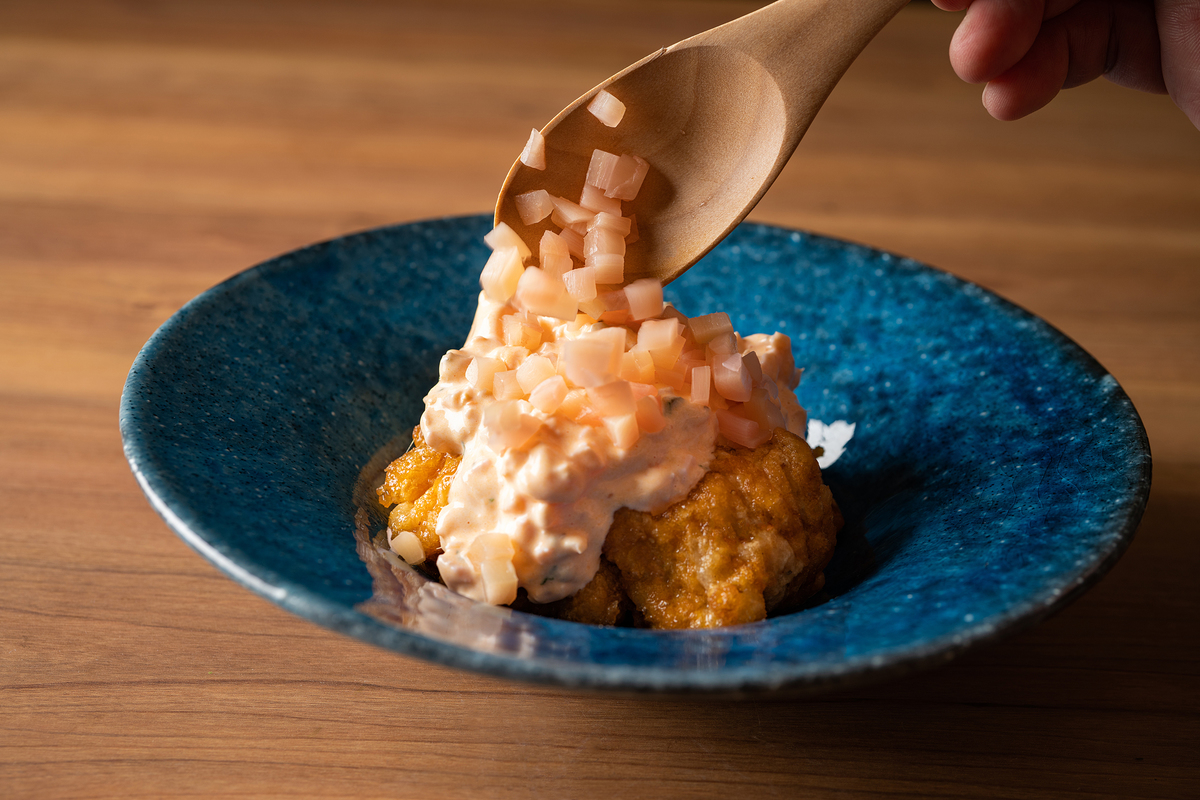 自家製のタルタルソースに、やさしい辛さ・爽やかな香り・シャキシャキ食感・さっぱりとした味わいが魅力の「岩下の新生姜」をたっぷり合わせました!