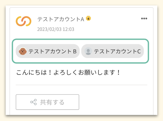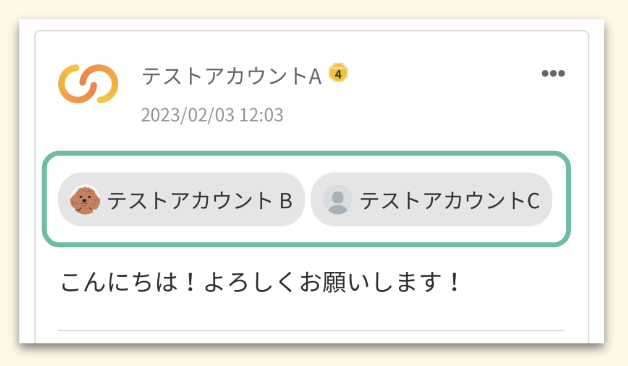 メンションしたユーザーが投稿やコメントの画面に表示されます。