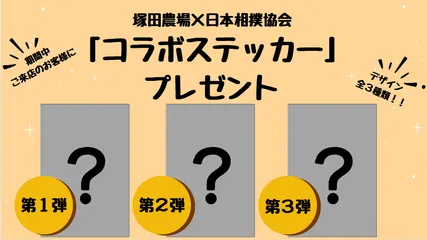 塚田場所ノベルティのご紹介★ 連日、友の会では大相撲とのコラボ話で盛り上がっております🎵 そんな今日は10月12日から始まっているノベルティについてご紹介です! 期間はコラボが終了する11月30日までで、ご来店されたお客様、「全てに」塚田農場×大相撲のコラボステッカーをプレゼント👏👏 しかも、第三弾